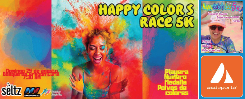 Happy Color`s Race 5k, la carrera de colores más espectacular, es una carrera para tod@s, tengas la edad que tengas, lleva a tu lomito porque somos Pet Friendly, el único requisito es venir con ganas de pasártela súper bien y disfrutar al maximo en compañía de miles de personas en un dia inolvidable disfrutando de la música, baile, running y de muchas sorpresas que se llevará a cabo en un ambiente familiar y de fiesta donde puedes participar disfrazado o caracterizado de tu personaje favorito, habrá muchos polvos, de colores en la zona de salida meta, burbujas, dos estaciones de polvos de colores durante la ruta atletica y mucha diversión donde podrás admirar la bella ruta panorámica de los Lagos del Bosque de Aragón.