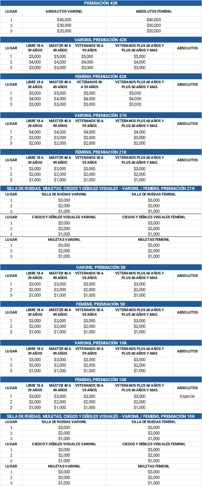 492,000 (Cuatrocientos noventa y dos mil pesos) a repartir en las diferentes ramas y categorías, descontándose el 7% a corredores nacionales y el 14 % a los extranjeros para la FMAA.